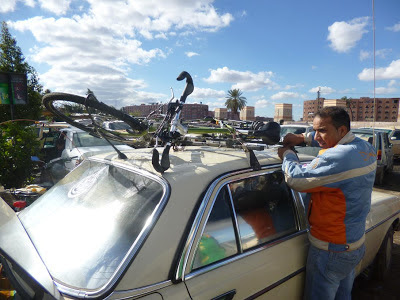 In Inezgane gaan ook geen bussen, maar staat wel een heel veld vol oude Mercedessen. Dat zijn gedeelde taxi´s; de bedoeling is dat je groepjes vormt van 6 mensen die naar dezelfde stad willen en dan brengt zo´n auto je daarheen met 4 man op de achterbank en 2 op de bijrijdersstoel. Ik had mazzel, de tweede man die me aansprak zocht nog een laatste persoon om een auto voor Marrakech vol te krijgen. De fiets werd met een can do-mentaliteit aangepakt en paste zonder veel moeilijkheden op het dak.